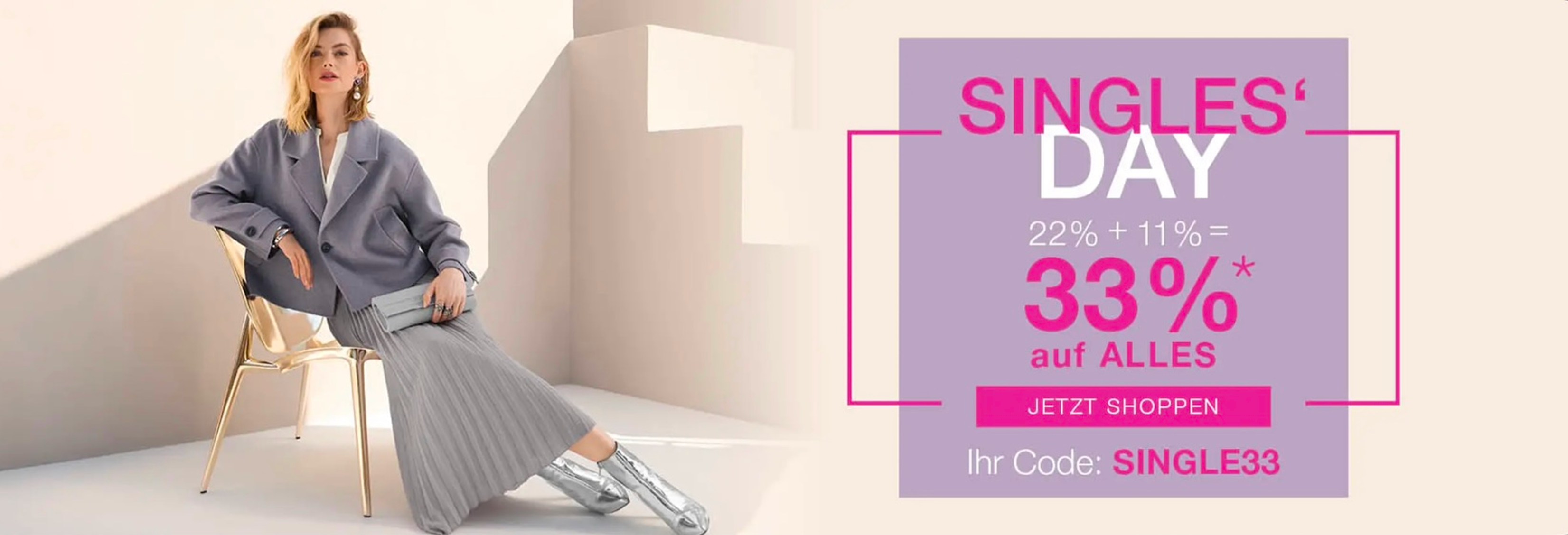 Немецкий бренд женской одежды Madeleine объявил о старте распродажи в честь Дня холостяков. При использовании промокода SINGLE33 предоставляется 33% скидка на весь ассортимент. В акции участвуют как базовые коллекции, так и сезонные новинки.